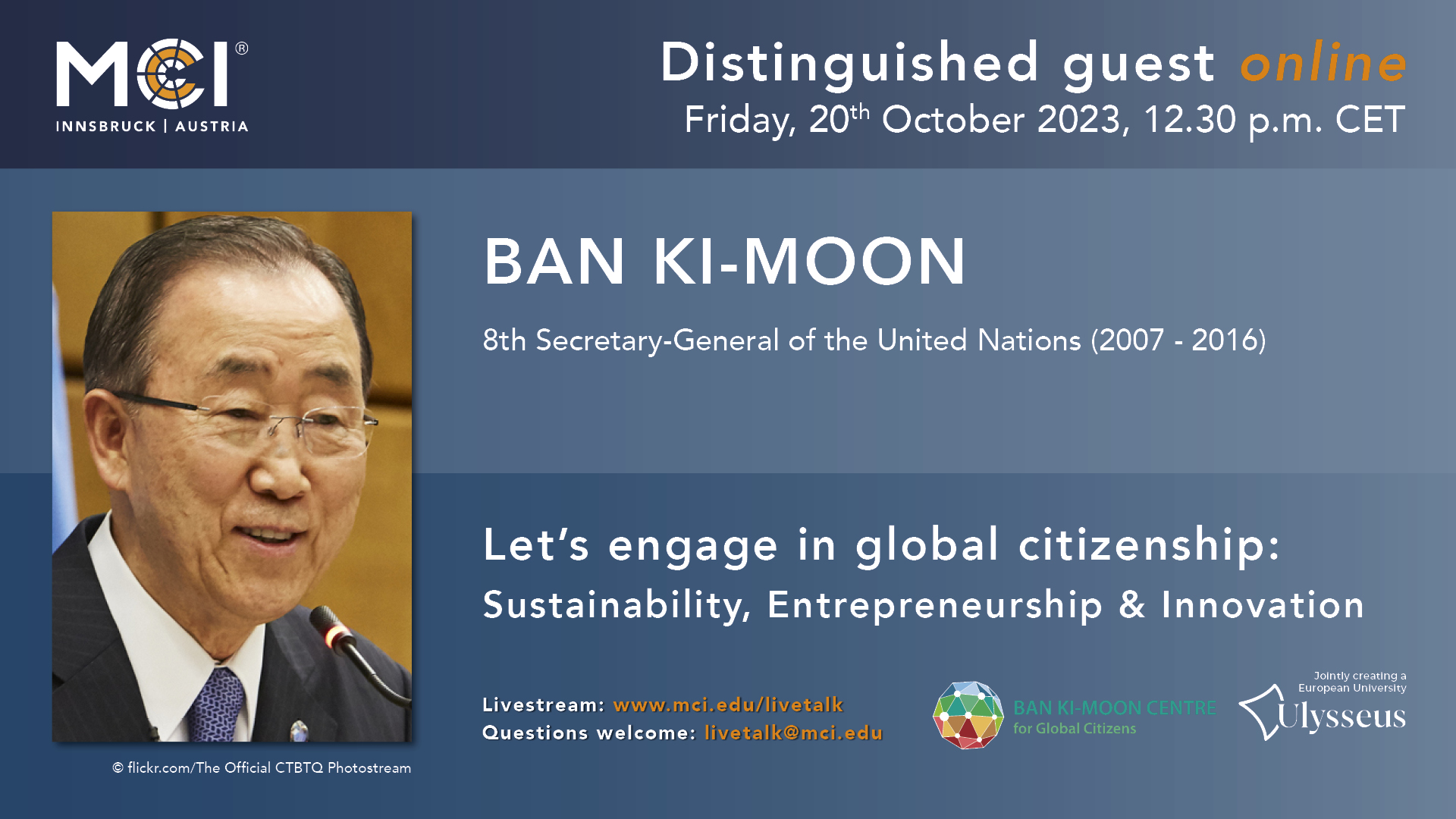 Ban Ki-moon’s journey from Eumseong to the United Nations is an inspiring example of how commitment, vision and tireless work can bring about positive change in the world. This year’s guest lecture by Ban Ki-moon is one in a series of annual guest lectures given by the eighth Secretary-General of the United Nations at the Entrepreneurial School®. A personal visit by Ban Ki-moon with an on-campus lecture at MCI is planned for next year