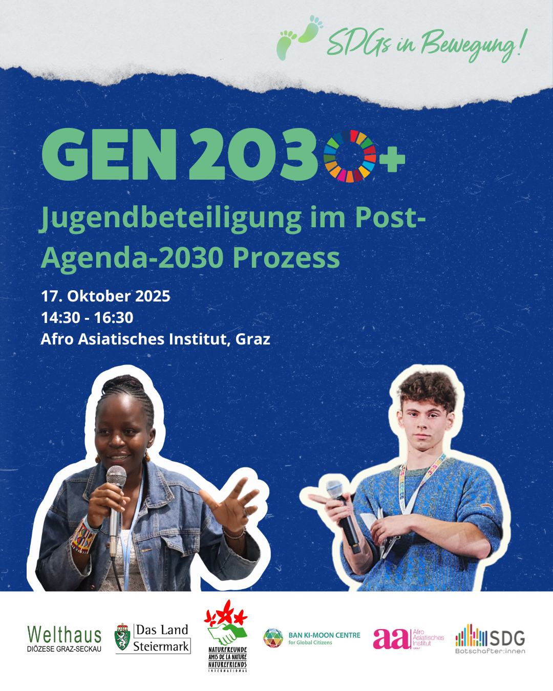 Der neue Leitfaden „SDGs in Bewegung“ – mit Methoden, die du direkt ausprobieren kannst. Zeit und Raum für Austausch, Reflexion und neue Kontakte Nach dem Mittagessen laden wir zur Podiumsdiskussion ein:GEN2030+ Jugendbeteiligung im Post-Agenda-2030 Prozess: Junge Menschen gestalten ihre Zukunft – was braucht es, damit ihre Stimme gehört wird? Diskutiere mit – bring deine Perspektive ein! Sei dabei und bring die SDGs in Bewegung! Wir freuen uns auf dich!
