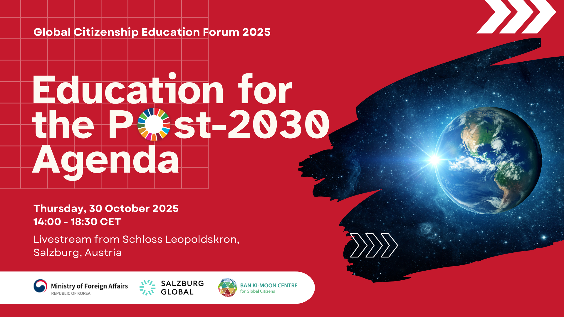 The Ban Ki-moon Foundation, in partnership with Salzburg Global and the Ministry of Foreign Affairs of the Republic of Korea, invites you to the International Forum on Education for the Post-2030 Agenda on Thursday, 30 October 2025 at Schloss Leopoldskron (Salzburg, Austria).