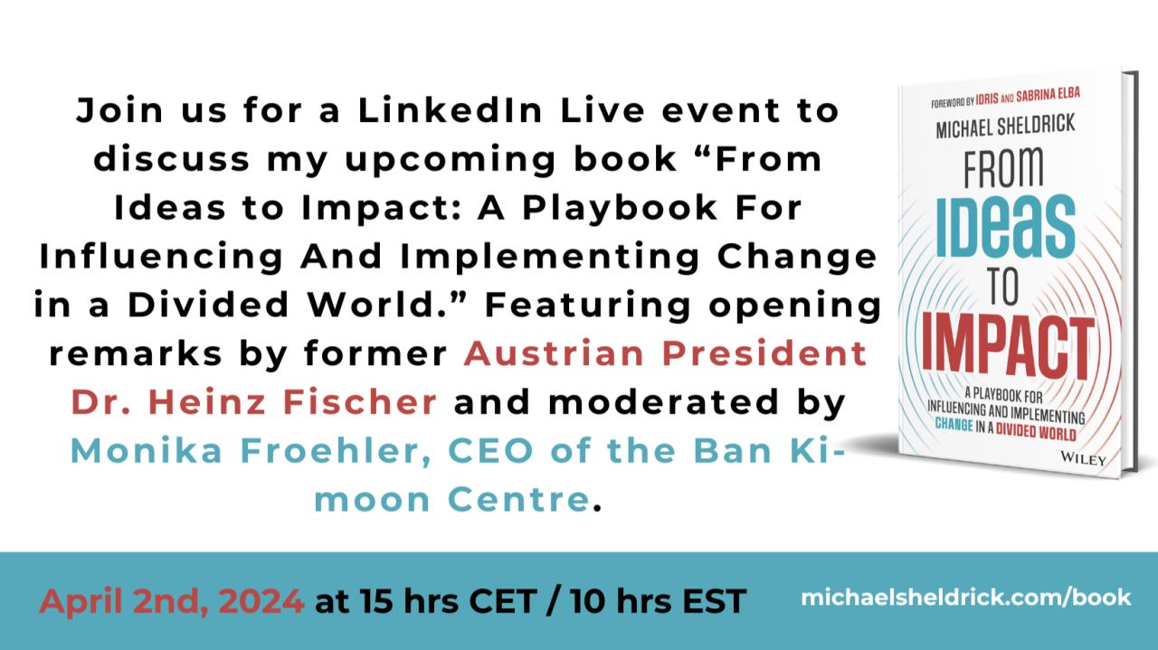 Join moderator Monika Froehler, CEO of the Ban Ki-moon Foundation, in a thought-provoking LinkedIn Live with Michael Sheldrick, co-founder of Global Citizen and BKMF Board Member on his latest book “From Ideas to Impact: A Playbook for Influencing and Implementing Change in a Divided World.”