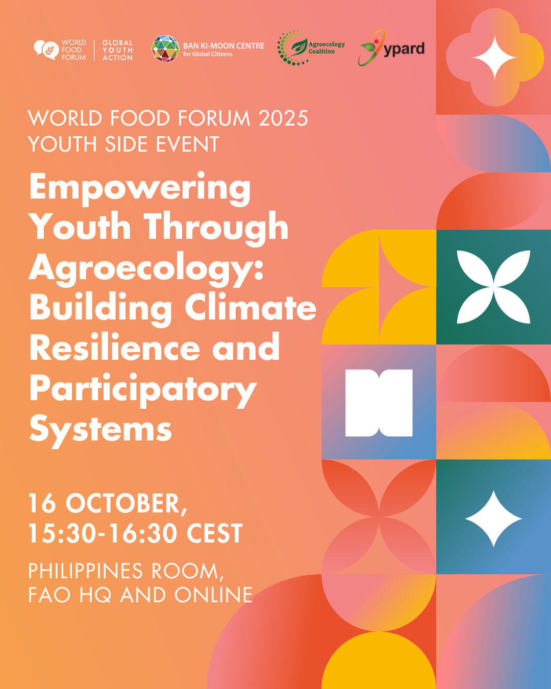 We are pleased to announce the World Food Forum’s Side Event 2025 “Empowering Youth Through Agroecology: Building Climate Resilience and Participatory Systems”, hosted by the Ban Ki-moon Foundation (BKMF), Agroecology Coalition, and YPARD, will take place on 16 October 2025, from 15.30 – 16.30 CEST at the Philippines Room, FAO Headquarters in Rome, Italy.