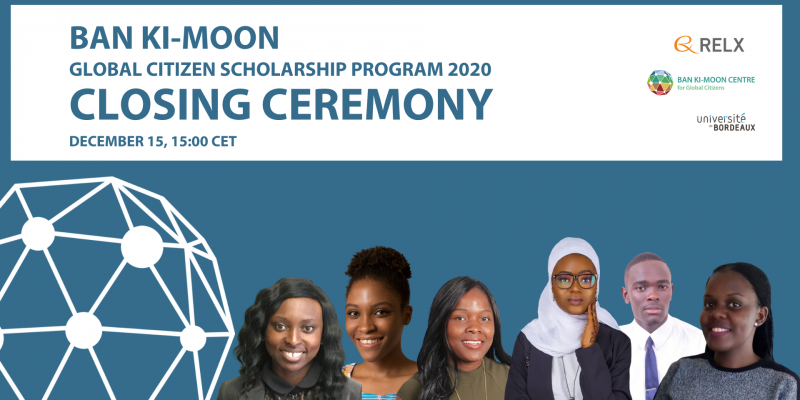 On December 15, 2020, the Ban Ki-moon Global Citizen Scholarship Program 2020’s Closing Ceremony took place. The BKMF, together with RELX & University of Bordeaux awarded, six extraordinary African Global Citizen Scholars – Akosua Pepra, Oduor Kevin, Hikmat Baba Dua, Tafadzwa Sachikonye, Barbara Nakijoba, and Ruvimbo Samanga – for successfully completing the scholarship program and implementing outstanding SDG Micro-Projects in their communities.