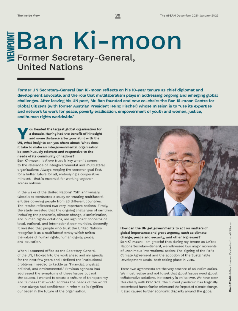 Ban Ki-moon Foundation Co-chair Ban Ki-moon reflects in “The ASEAN”‘s December/ January Edition on his 10-year tenure as chief diplomat of the United Nations, the role of multilateralism to solve global challenges, and why youth-driven responses give him hope for the future of our planet and its people.