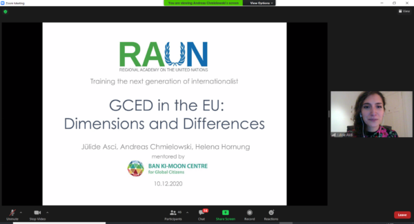 The BKMF RAUN scholars presented the methodology and results of their paper on “Global Citizenship Education in the European Union: Dimensions and Differences”. With the creation of 114 qualitative indicators, Andreas, Helena, and Jülide tackled the blind spots of GCED and investigated its concrete application. They concluded that in GCED, the focus lies on the learning process, moral development within, dialogue, and empathy.