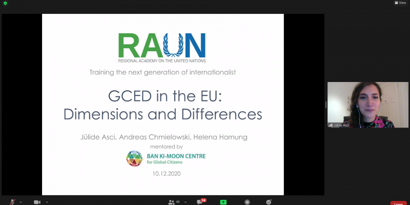 The BKMF RAUN scholars presented the methodology and results of their paper on “Global Citizenship Education in the European Union: Dimensions and Differences”. With the creation of 114 qualitative indicators, Andreas, Helena, and Jülide tackled the blind spots of GCED and investigated its concrete application. They concluded that in GCED, the focus lies on the learning process, moral development within, dialogue, and empathy.