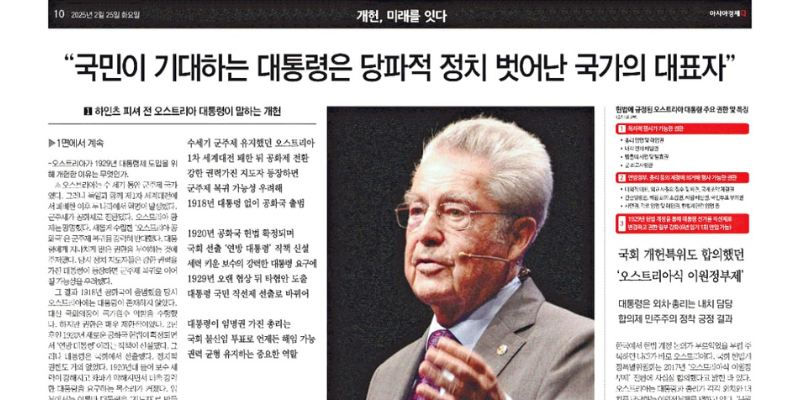 In a written interview with Asia Economy on the 25th, former Austrian President Heinz Fischer shared his views when asked about the qualities necessary to become a respected president. Fischer served as Austria’s 11th president from 2004 to 2016. He studied law and served as the leader of the Social Democratic Party (SPÖ) for eight years from 1975. Additionally, he held key roles in both government and parliament, including Minister of Science and Speaker of the National Council.