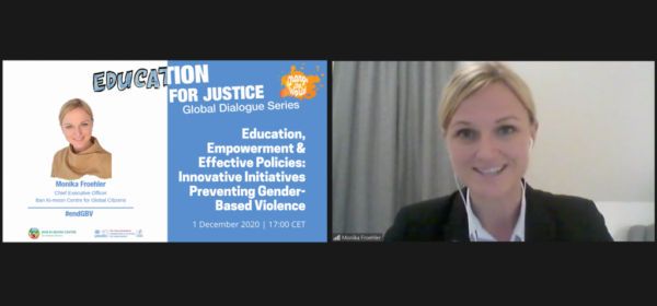 As a part of 16 Days of Activism against Gender-Based Violence and the Orange the World Campaign, the Ban Ki-moon Foundation hosted an interactive session during the Education for Justice Global Dialogue Series organized by the United Nations Office of Drugs & Crime.