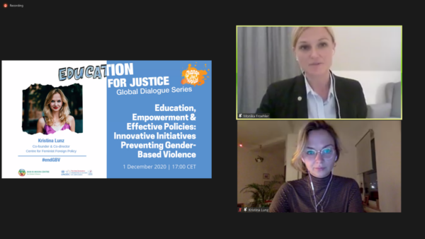 With regards to effective policies for #GBV, Kristina Lunz, Co-founder & Co-director of the Centre for Feminist Foreign Policy underlined how current ideas and concepts in the security and foreign policy sector are based on an idea of dominating other states and individuals. She claimed: “Domination always requires violence. Gender-based violence is an epidemic in our society – we will only be able to overcome male violence against women once we have created a society based on equality. An end to violence is always grounded in mutual respect. “