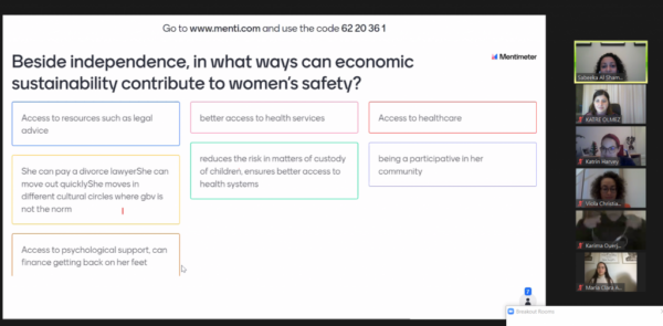 Following the presentations, the audience was invited to join three virtual booths with each expert (Education, Empowerment, and Effective Policies) to engage in a brainstorming session and discuss innovative initiatives to prevent gender-based violence.