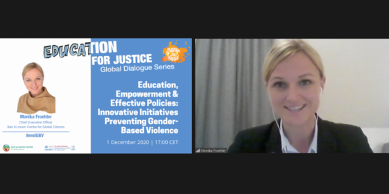 As a part of 16 Days of Activism against Gender-Based Violence and the Orange the World Campaign, the Ban Ki-moon Foundation hosted an interactive session during the Education for Justice Global Dialogue Series organized by the United Nations Office of Drugs & Crime.