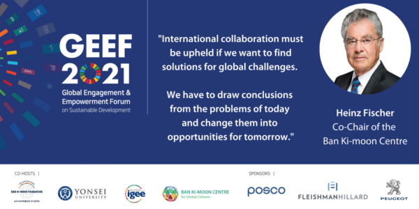 The opening ceremony on February 5th, led by BKMF Co-chair Ban Ki-moon, Co-Chair Heinz Fischer, and President of Yonsei University Seoung Hwan Suh, gave us a clear call for action: We need to reimagine the global community and partnership to overcome COVID-19, and accelerate the achievement of the SDGs.