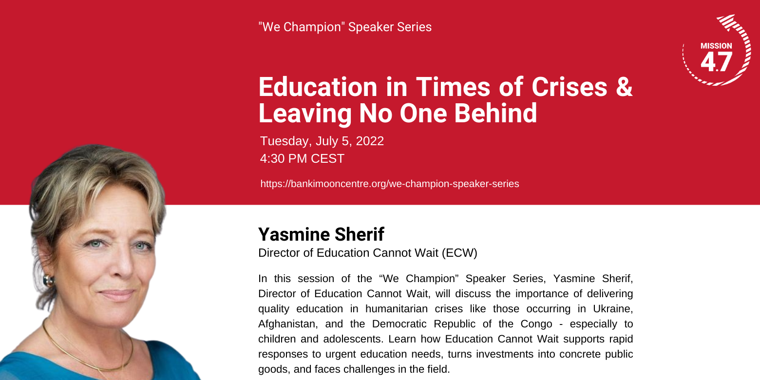 The event will welcome Director of Education Cannot WaitYasmine Sherif to discuss the importance of delivering quality education in humanitarian crises like those occurring in Ukraine, Afghanistan, and the Democratic Republic of the Congo – especially to children and adolescents. Learn how Education Cannot Wait supports rapid responses to urgent education needs, turns investments into concrete public goods, and faces challenges in the field. Building on Mission 4.7’s #WeChampion social media campaign, the “We Champion” speaker series showcases best practices and innovative approaches to Transformative Education from across the Mission 4.7 community and beyond. The series will help further collective thinking around SDG 4.7 implementation and gather momentum on various thematic areas pertaining to SDG 4.7. AGENDA: